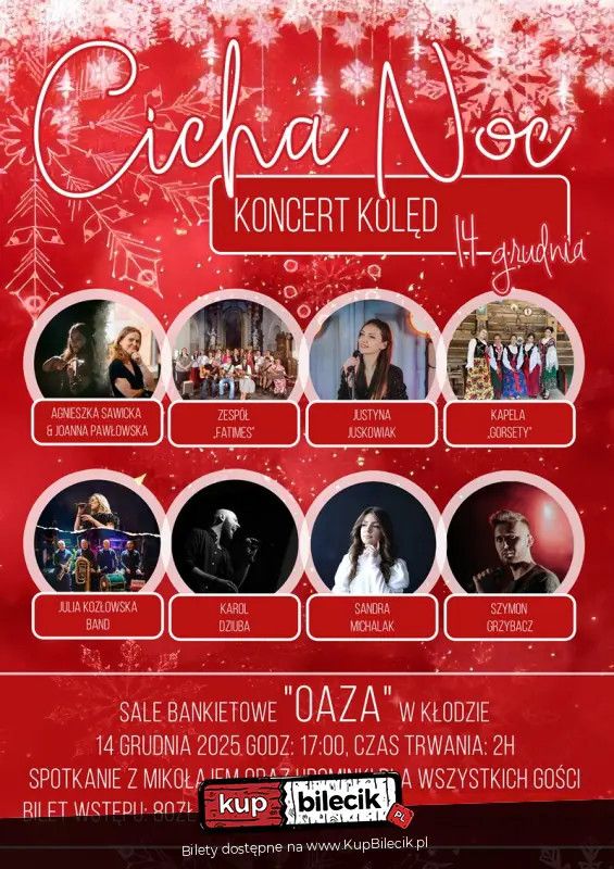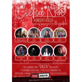 | Koncert Kolęd "Cicha Noc"dodano 2025-11-25 11:13:44 Świąteczne wydarzenie, na które wszyscy czekają - Koncert Kolęd "Cicha Noc". Bilety do nabycia na: KupBilecik.plKoncert Kolęd artyści: Jarosław Chilkiewicz i PrzyjacieleNie przegap tej okazji do wspólnego kolędowania i celebrowania piękna muzyki w niepowtarzalnej oprawie. To wieczór, który ogrzeje nasze serca i pozostanie w nich na długo. Serdecznie zapraszamy! Bilety do nabycia na: KupBilecik.pl |